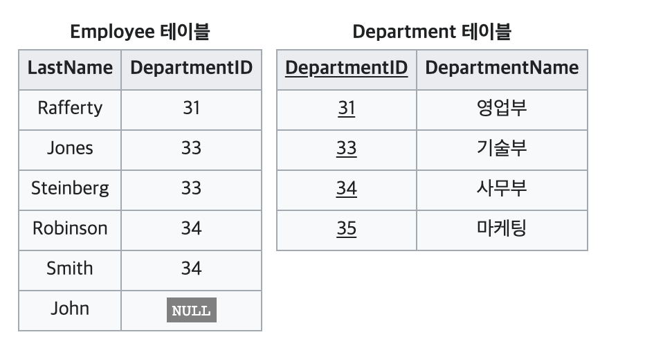 2개의 테이블에서 각각의 공통값을 이용함으로써 필드를 조합하는 수단이 된다.