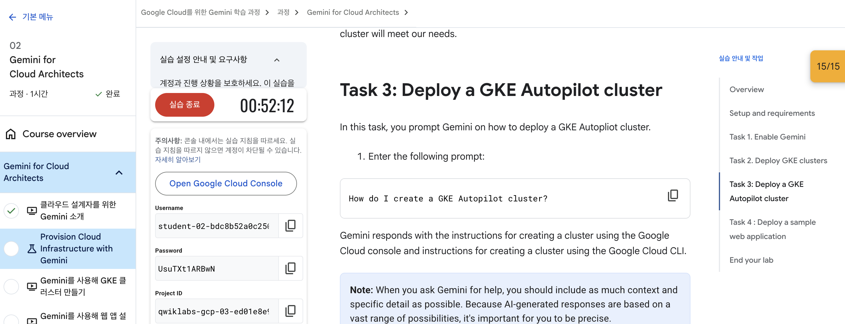 그리고 모듈 3(gcloud CLI를 사용하여 GKE Autopilot 클러스터 생성하기)의 실습의 경우 세 번의 시도 끝에 통과를 할 수 있었다.